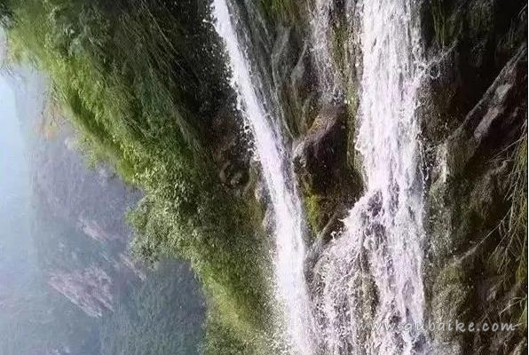 瀑布从险峻的壁崖上飞泻而下,银河倒挂,壮美秀丽。岸边的悬崖峭壁上时而会看见野生猕猴的身影。