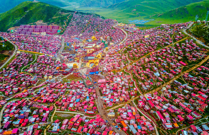 这里以佛学院的大经堂为中心,密密麻麻搭满了四面的山坡,不计其数的绛红色小木屋,延绵无数,一眼望不到头,给人一种庄然威武的感觉。这些红色小木屋,是一万多名僧侣的住所(出家男子称扎巴,出家女子称觉姆即女尊者)。